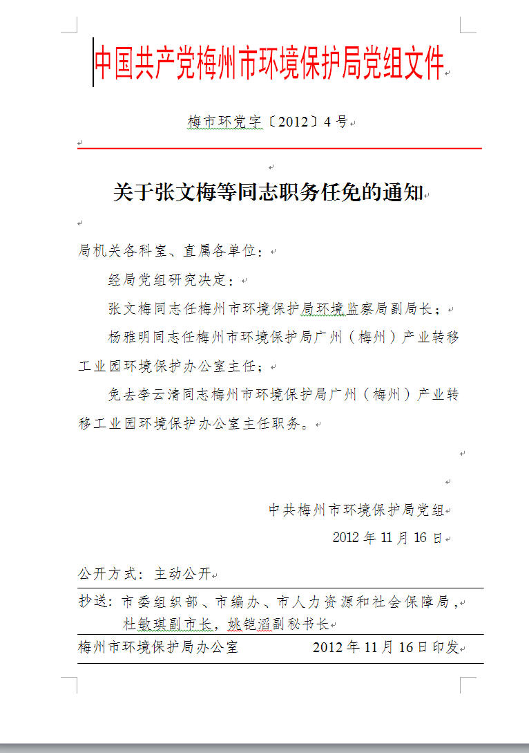 梅州市人民政府門戶網站 梅州市生態環境局 人事信息 關於張文梅等同誌職務任免的通知