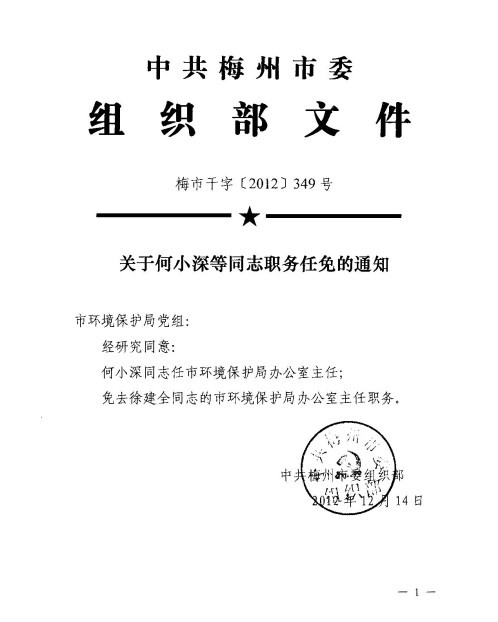 梅州市人民政府門戶網站 梅州市生態環境局 人事信息 關於何小深等同誌職務任免的通知