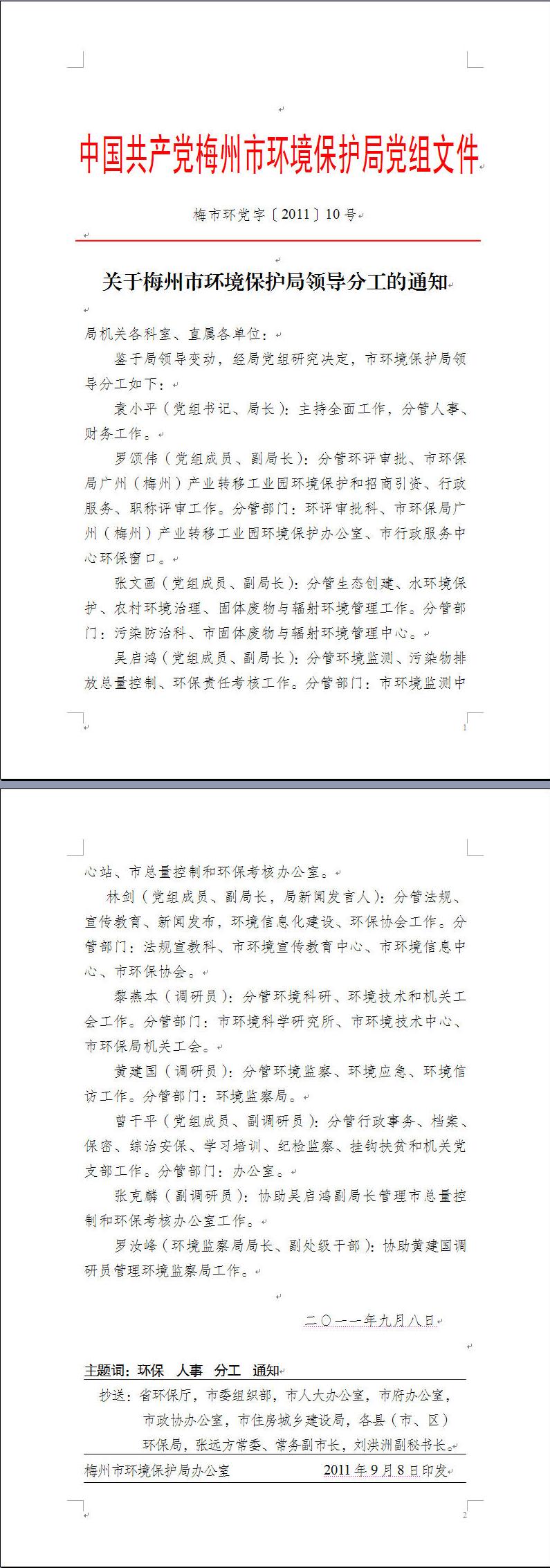梅州市人民政府門戶網站 梅州市生態環境局 人事信息 關於梅州市環境保護局領導分工的通知
