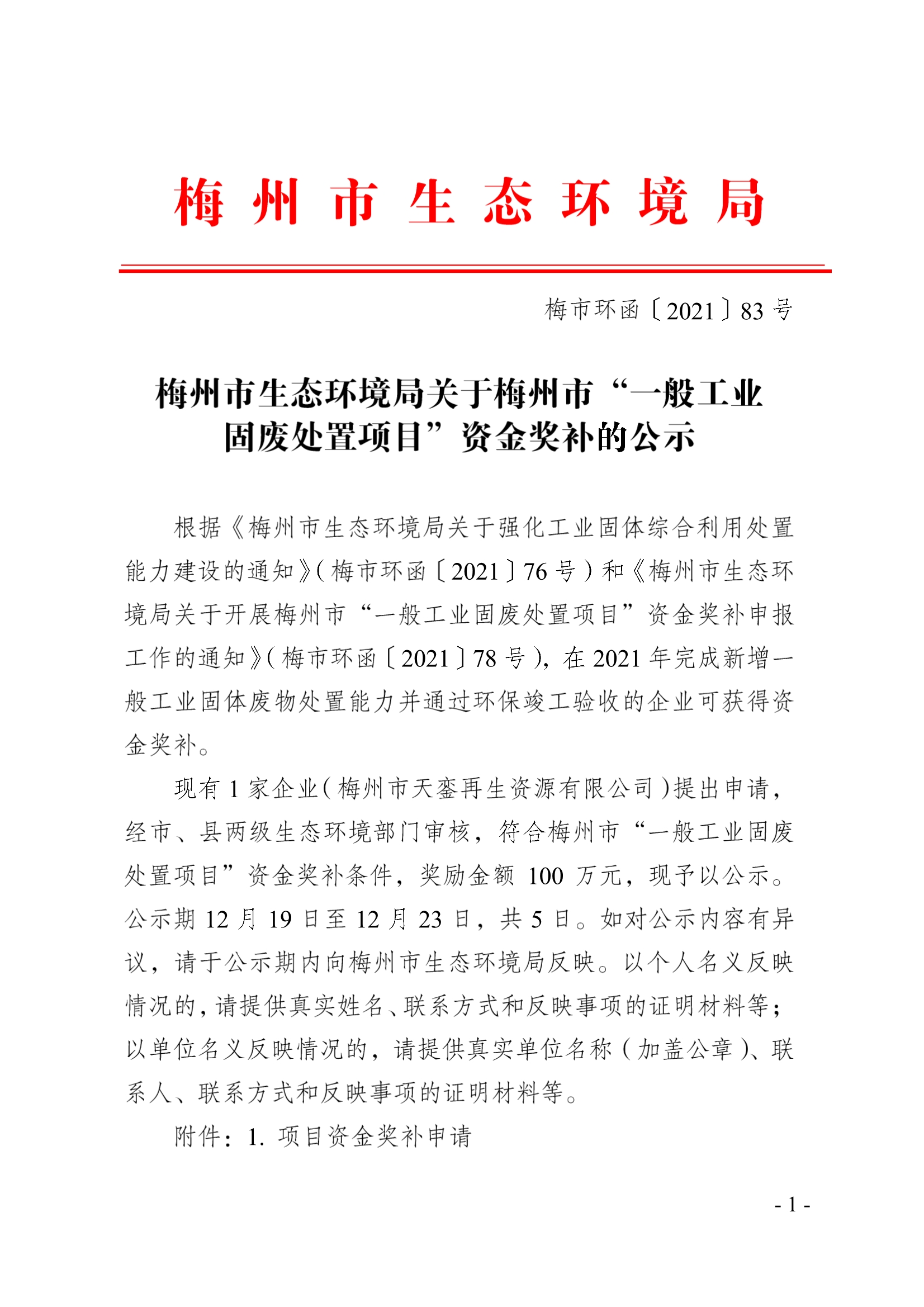 梅州市人民政府門戶網站 梅州市生態環境局 通知公告 梅州市生態環境局關於梅州市“一般工業固廢處置項目”資金獎補的公示(梅市環函〔2021〕83號 )