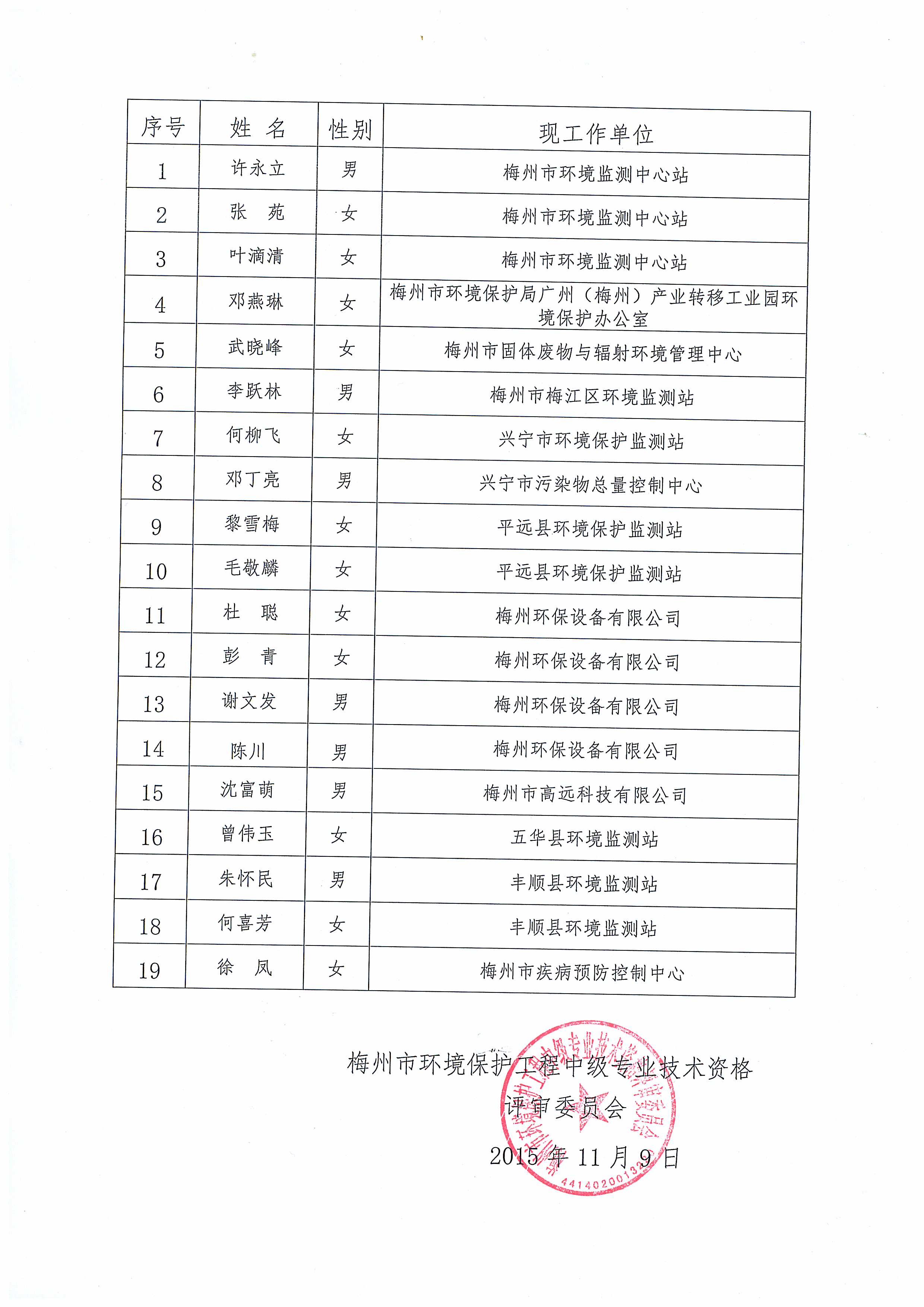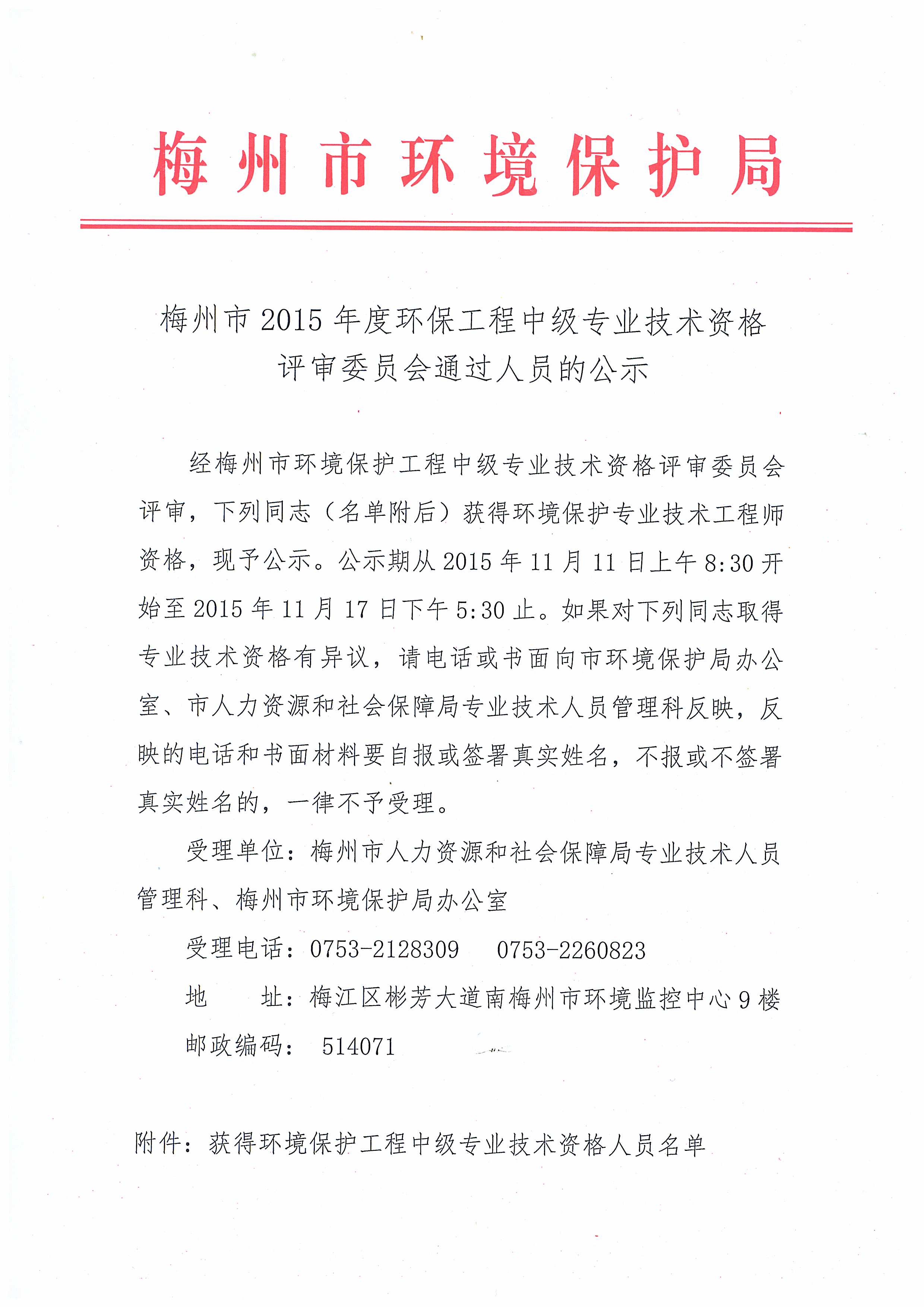 梅州市人民政府門戶網站 梅州市生態環境局 通知公告 梅州市2015年度環保工程中級專業技術資格評審委員會通知人員的公示