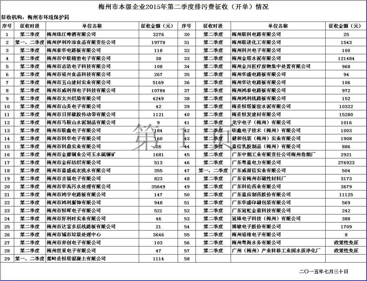 梅州市人民政府門戶網站 梅州市生態環境局 排汙許可信息 梅州市本級企業2015年第二季度排汙費征收(開單)情況