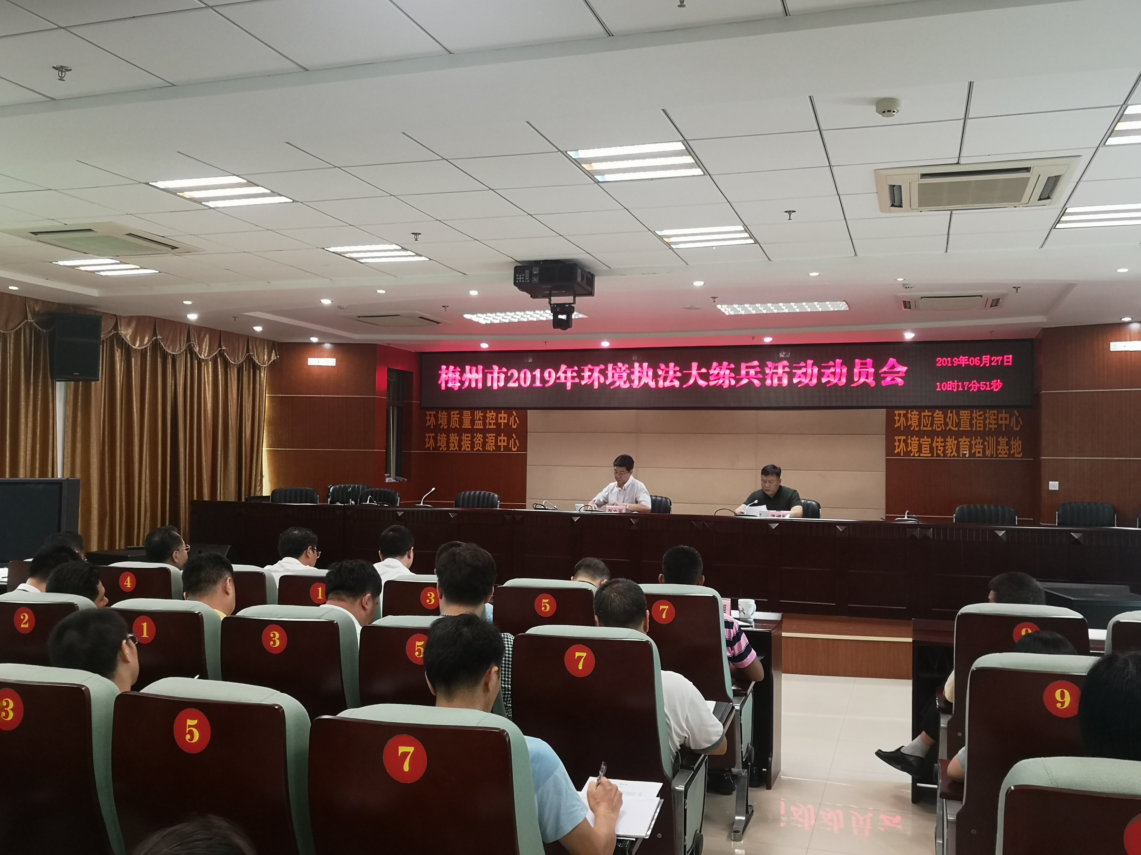 為營造全市生態環境保護執法係統“學業務技能、當崗位標兵、打好攻堅戰”的執法氛圍,不斷提升隊伍素質和執法效能,打造生態環境執法鐵軍,6月27日上午,梅州市生態環境局召開2019年生態環境保護執法大練兵動員部署會議,市生態環境局黨組成員、副局長張文畫同誌參加會議並做動員講話。各縣(市、區)環保局局長、分管副局長、環境監察大隊負責人、環境應急和環境信訪負責同誌,市生態環境局機關各科室、直屬各單位負責同誌、執法監督科全體執法人員等共六十餘人在梅州市環境監控中心參加會議。