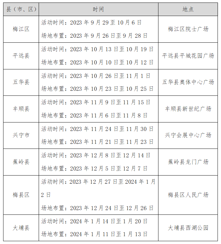 “梅品惠”梅州城市促消費公共品牌是梅州市商務局響應打造廣東“粵消費·粵精彩”1+21城市促消費節日品牌矩陣而創立的品牌活動,並以此為依托統領全市促消費活動。 2023梅品惠全市促消費活動暨梅州汽車家電下鄉巡回展作為今年梅州促消費活動的主導項目,將在各縣(市、區)人流量高的廣場舉行,結合各縣特色開展獨具風格的展會,具體時間地點安排如下: