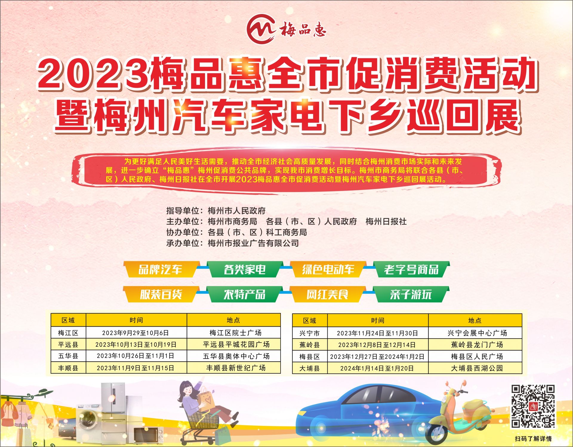 為更好滿足人民美好生活需要,推動全市經濟社會高質量發展,同時結合梅州消費市場實際和未來發展,進一步確立“梅品惠”梅州促消費公共品牌,實現我市消費增長目標,由梅州市人民政府指導、梅州市商務局、各縣(市區)人民政府以及梅州日報社聯合主辦的2023梅品惠全市促消費活動暨梅州汽車家電下鄉巡回展活動即將在全市拉開帷幕,助推消費升級,促進消費活力!