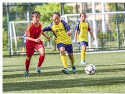 7月21日,女子足球丙組決賽五華隊與梅江隊雙方隊員在場上激烈拚搶,烈日與汗水交織在臉上。(吳騰江 攝)