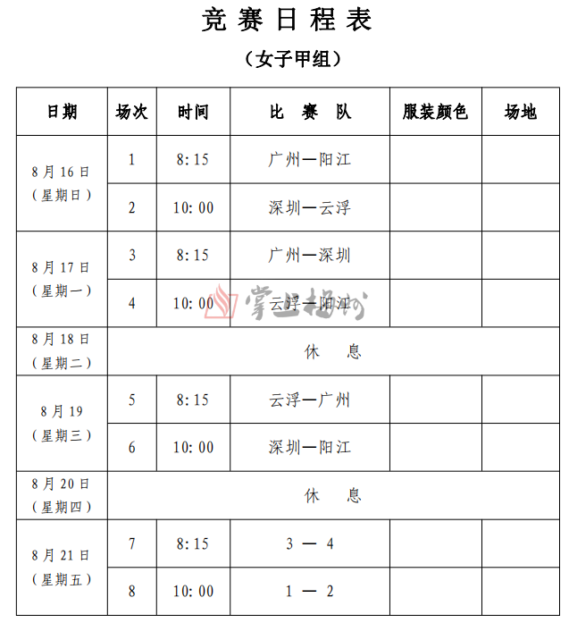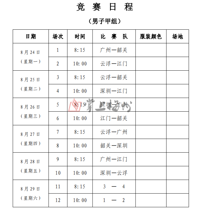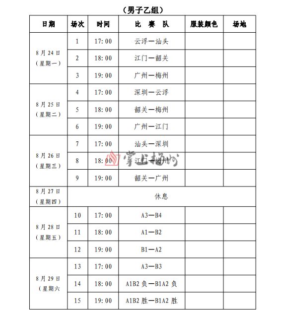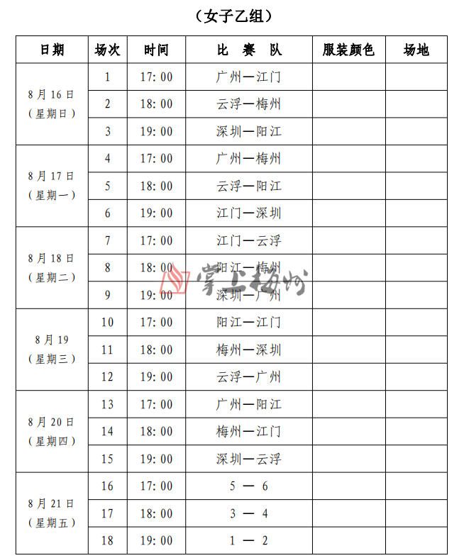 其中,男甲參賽隊5支、男乙參賽隊7支、女甲參賽隊4支、女乙參賽隊6支。梅州代表隊參加男乙、女乙的賽事。比賽時間為8 月 16 日至 21 日(女子),8 月 24 日至 29 日(男子)。