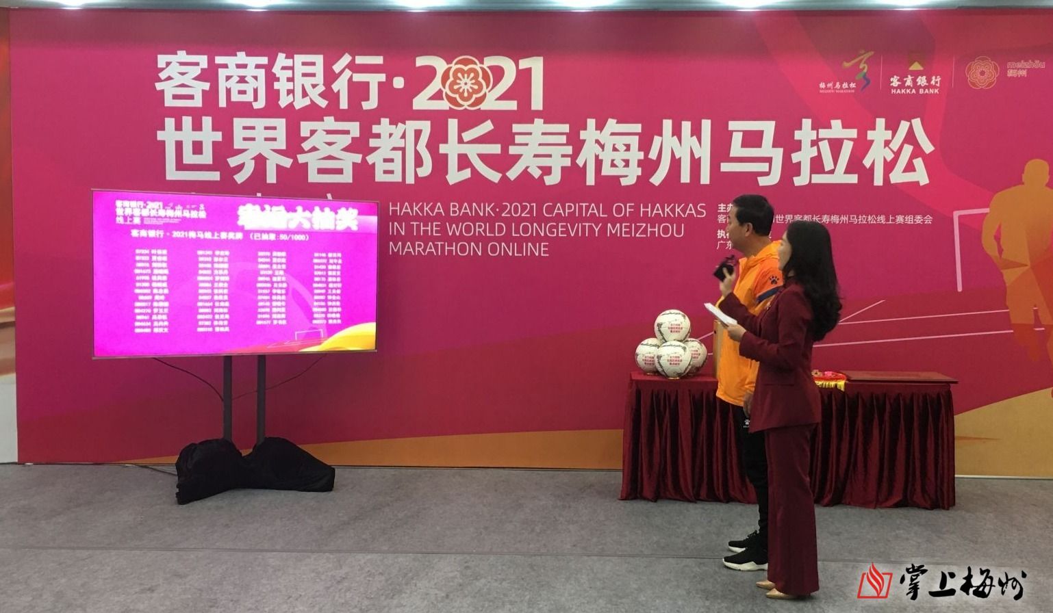 上午10時許,抽獎儀式開始,本次抽獎共抽出了1000塊本屆梅州馬拉鬆線上賽紀念獎牌,500個梅州馬拉鬆定製足球,100份梅州柚,100個下屆梅州馬拉鬆線下賽事免費直通名額,免費贈送給本屆賽事的完賽選手。獲獎名單將在“梅州馬拉鬆賽”微信公眾號上進行公示,並通過短信提示全體獲獎選手於17日18時前登記收件地址領獎。