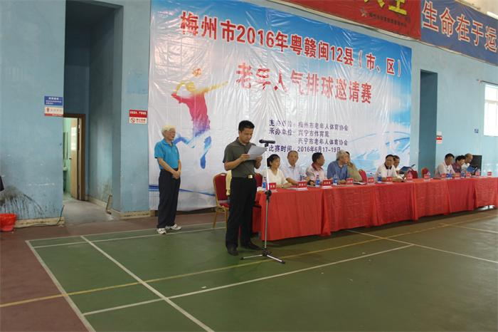由梅州市老年人體育協會主辦、興寧市體育局、興寧市老年人體育協會承辦的梅州市2016年粵贛閩12縣(市、區)老年人氣排球邀請賽於2016年6月17日—19日在興寧市體育綜合訓練館舉行,來自江西尋烏、福建武平、廣東揭陽以及梅州各市、縣區共23支男、女代表隊近200名隊員參加角逐。17日下午3時舉行開幕式,開幕式由梅州市老體協常務副主席陳珍書同誌主持,興寧市人民政府副市長彭誌洪同誌致歡迎詞,梅州市老體協主席劉廣新同誌講話,介紹了本次比賽的籌辦等有關情況,最後由梅州市老體協名譽主席何萬真同誌宣布比賽開始。