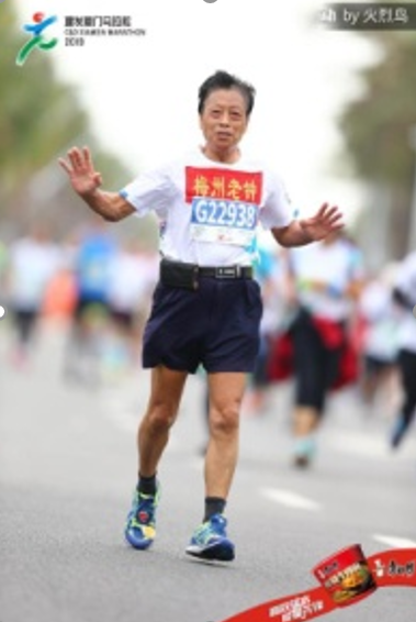 鍾延炎,榮譽會長,跑圈著名的梅州老鍾,成績5小時23分。古稀之年的他連續第九年參加廈門馬拉鬆賽,跑滿十屆即可獲得廈馬專屬號碼終身免抽簽免費參賽。