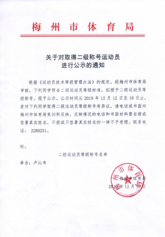 梅州市人民政府門戶網站 梅州市體育局 通知公告 對取得二級稱號運動員進行公示的通知