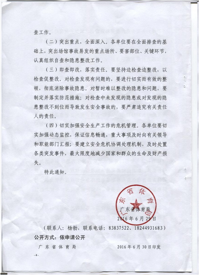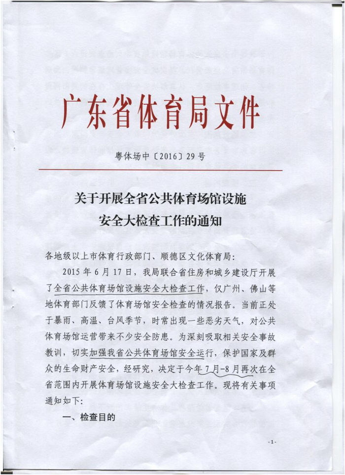 現將省體育局《關於開展全省體育場館設施安全大檢查工作的通知》(粵體場中〔2016〕29號)轉發給你們,請認真貫徹執行。請抓緊時間組織對轄區內體育場館安全生產情況進行自查自改,並將自查自改情況報告於7月25日前報市體育局。