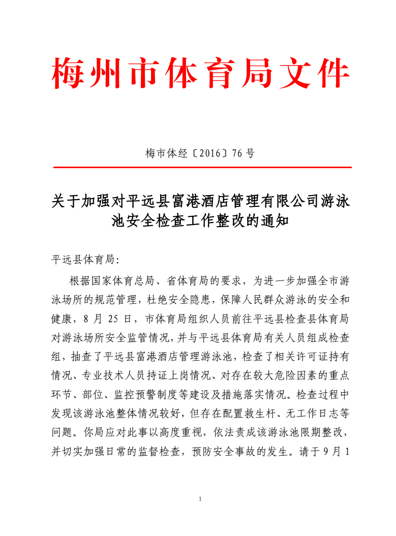 梅州市人民政府門戶網站 梅州市體育局 通知公告 關於加強對平遠縣遊泳池檢查工作的通知〔2016〕76號