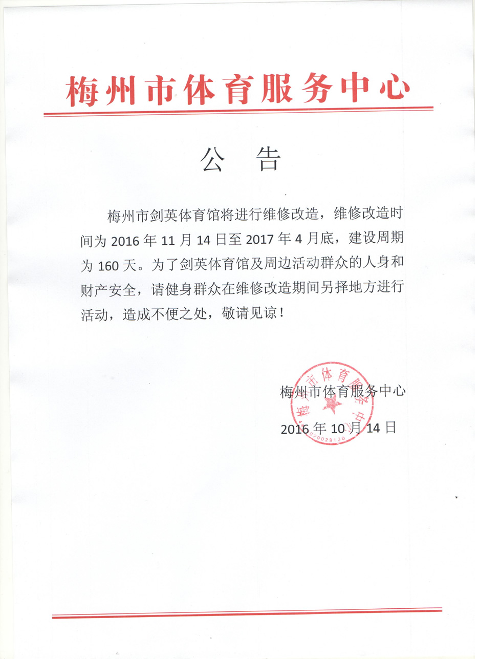 梅州市人民政府門戶網站 梅州市體育局 通知公告 梅州市劍英體育館維修改造公告