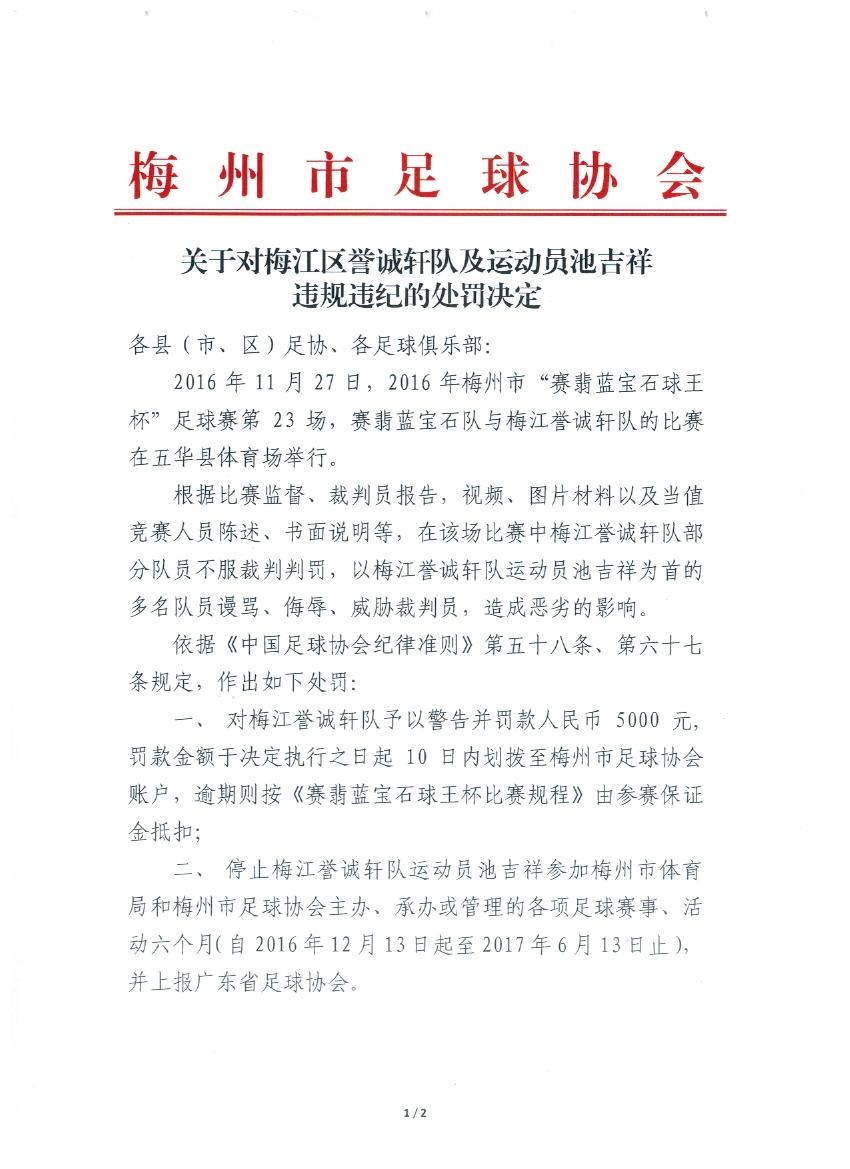 梅州市人民政府門戶網站 梅州市體育局 通知公告 梅州市足球協會關於對關於對梅江區譽誠軒隊及運動員池吉祥違規違紀的處罰決定