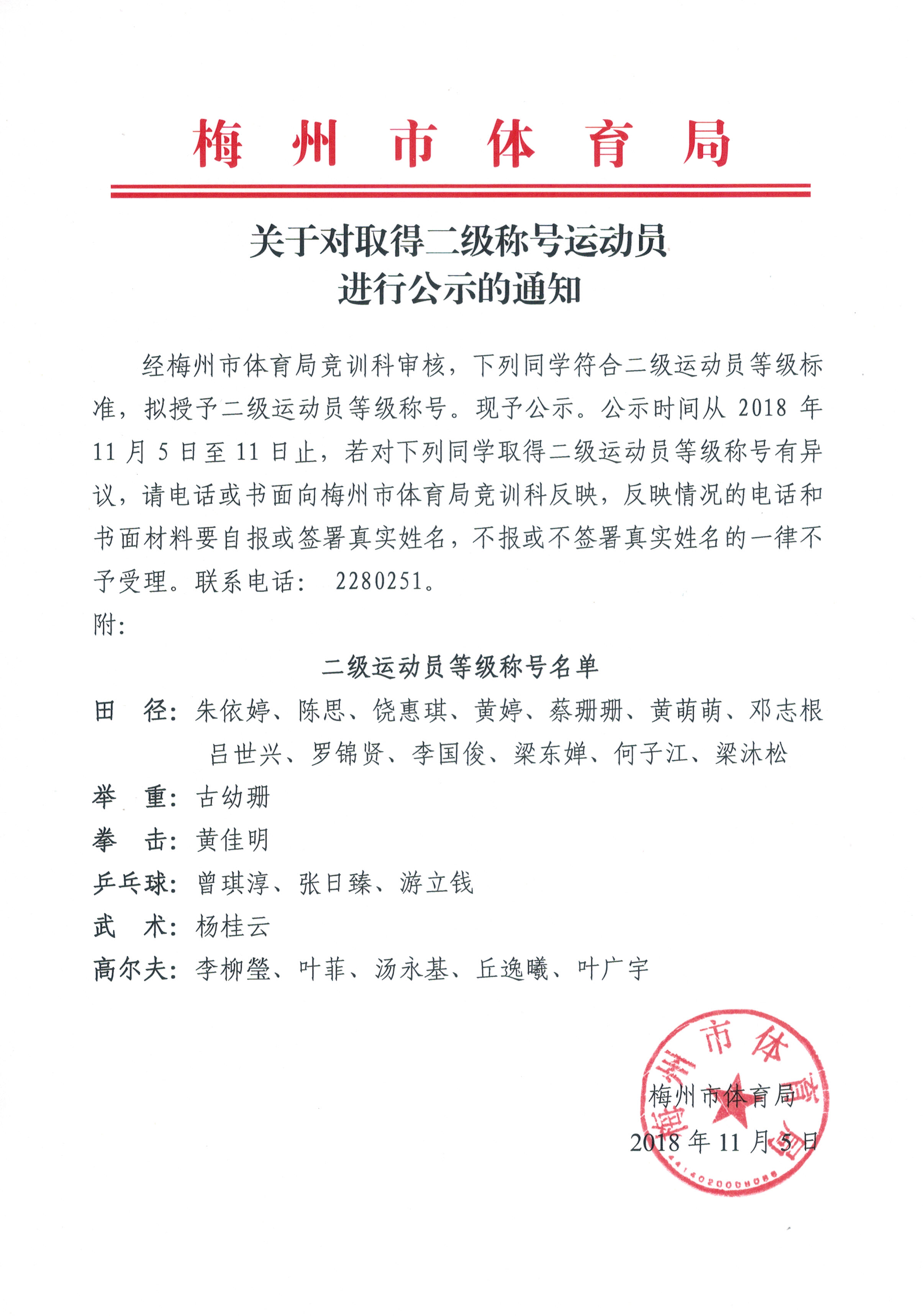 梅州市人民政府門戶網站 梅州市體育局 通知公告 關於對取得二級稱號運動員進行公示的通知