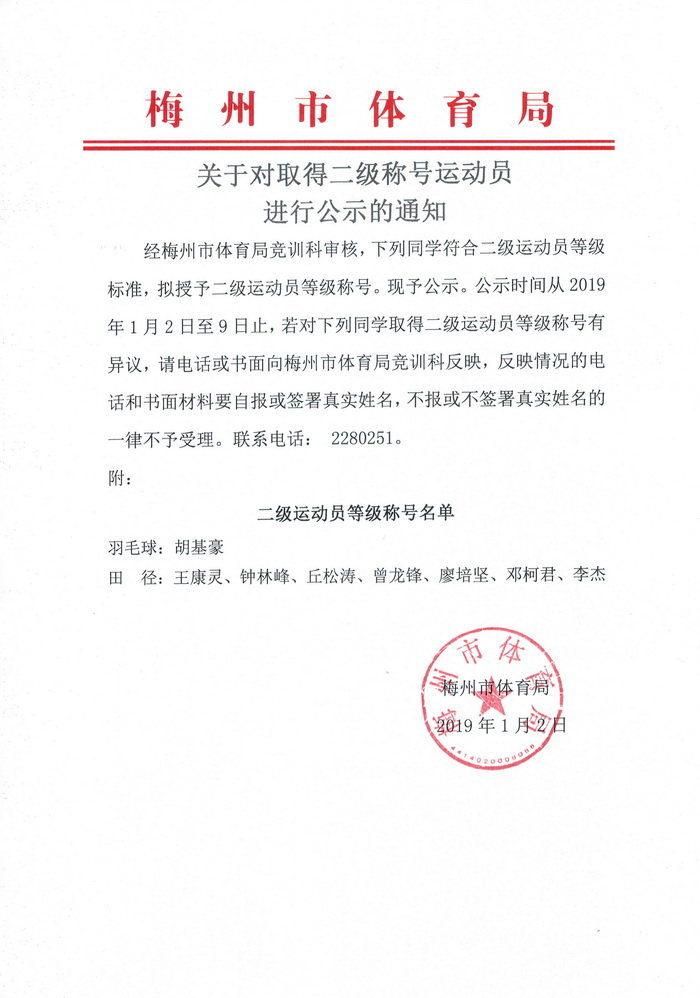 梅州市人民政府門戶網站 梅州市體育局 通知公告 對於取得二級稱號運動員進行公示的通知