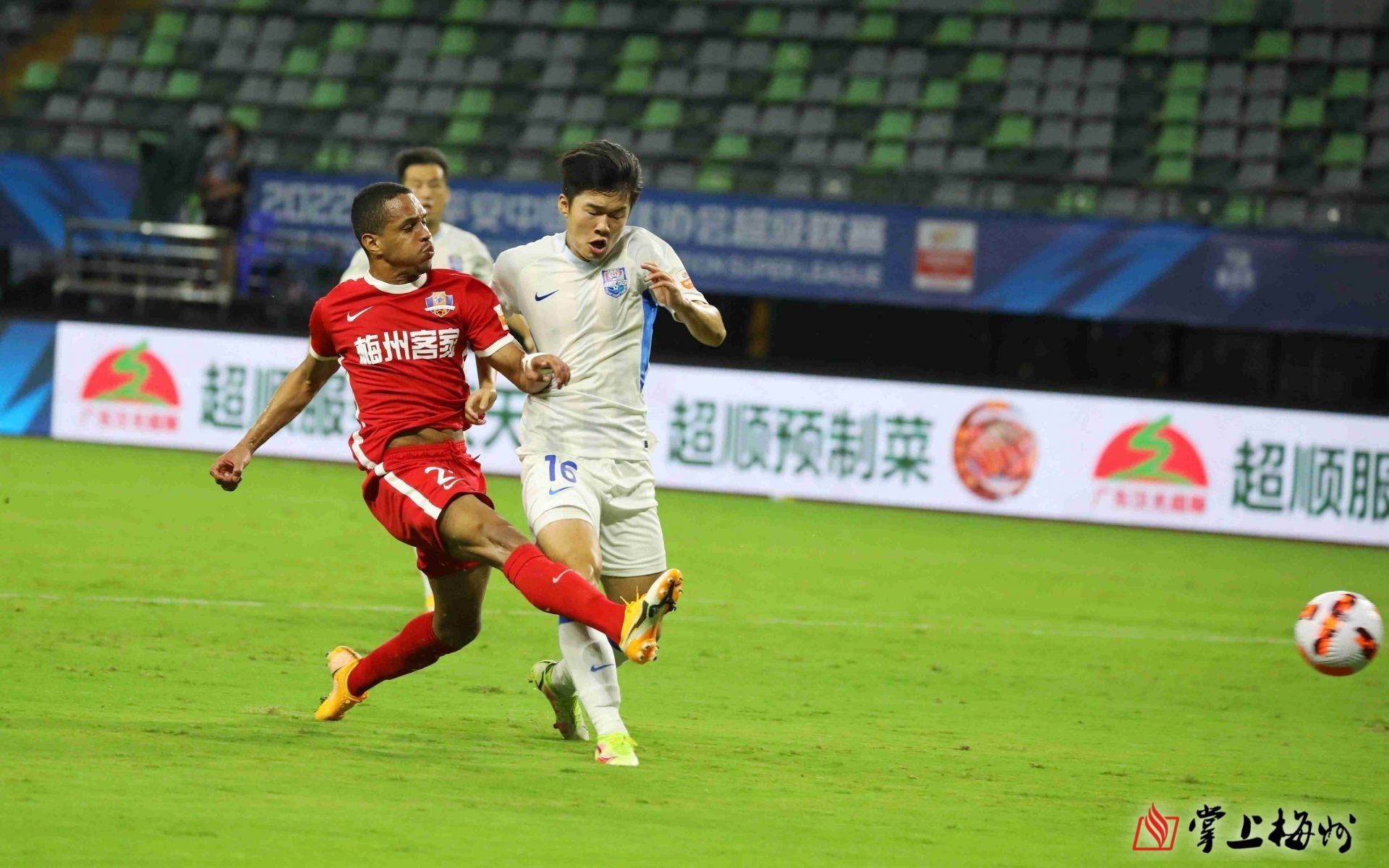 第13分鍾,梅州客家在反擊中攻進中超首粒進球,巴西外援羅德裏格持球突入禁區,擺脫防守隊員一腳中的。(林翔 攝)