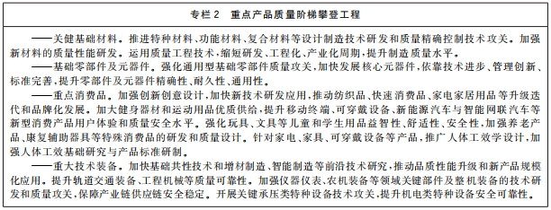 (九)打造區域質量發展新優勢。加強質量政策引導,推動區域質量發展與生產力布局、區位優勢、環境承載能力及社會發展需求對接融合。推動東部地區發揮質量變革創新的引領帶動作用,增強質量競爭新優勢,實現整體質量提升。引導中西部地區因地製宜發展特色產業,促進區域內支柱產業質量升級,培育形成質量發展比較優勢。推動東北地區優化質量發展環境,加快新舊動能轉換,促進產業改造升級和質量振興。健全區域質量合作互助機製,推動區域質量協同發展。深化質量強省建設,推動質量強市、質量強業向縱深發展,打造質量強國建設標杆。