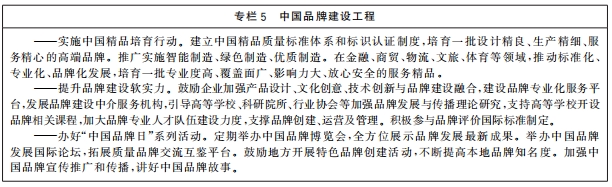 ——品牌建設取得更大進展。品牌培育、發展、壯大的促進機製和支持製度更加健全,品牌建設水平顯著提高,企業爭創品牌、大眾信賴品牌的社會氛圍更加濃厚,品質卓越、特色鮮明的品牌領軍企業持續湧現,形成一大批質量過硬、優勢明顯的中國品牌。