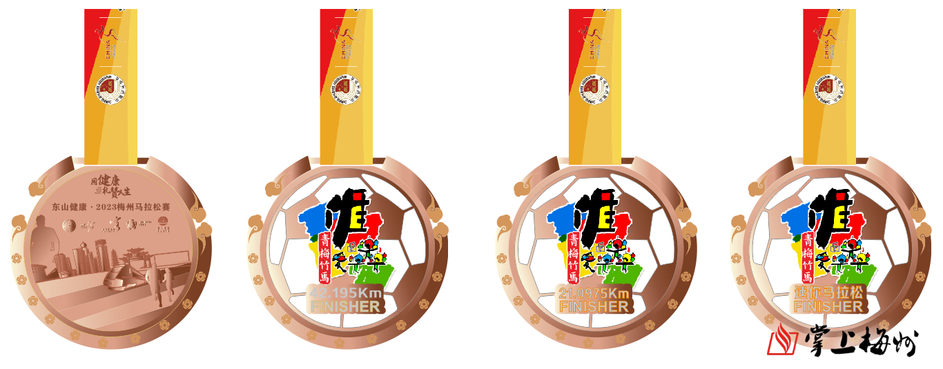 本屆賽事完賽紀念獎牌正麵設計主要運用了土樓、梅州西站等梅州特色建築,梅花、祥雲裝飾等梅州特色畫麵,以及運動健將們跑過梅州特有風景,用心體驗獨特的地標建築,留下屬於跑馬人的印記,象征著全民健身運動在梅州的蓬勃發展。