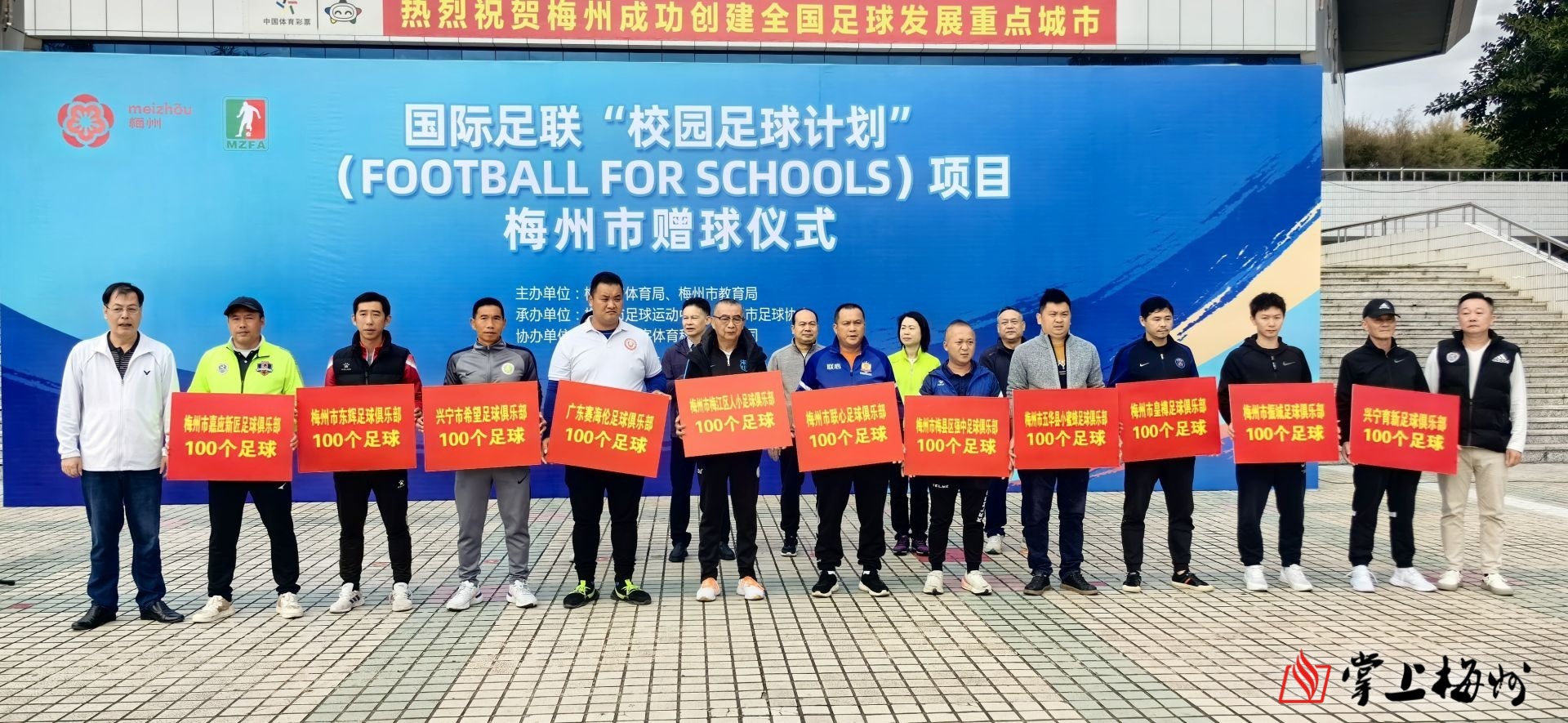 11月29日上午,由梅州市體育局、梅州市教育局主辦,梅州市足球運動中心、梅州市足球協會承辦的國際足聯“校園足球計劃”項目梅州市贈球儀式在梅城劍英體育館舉行。
