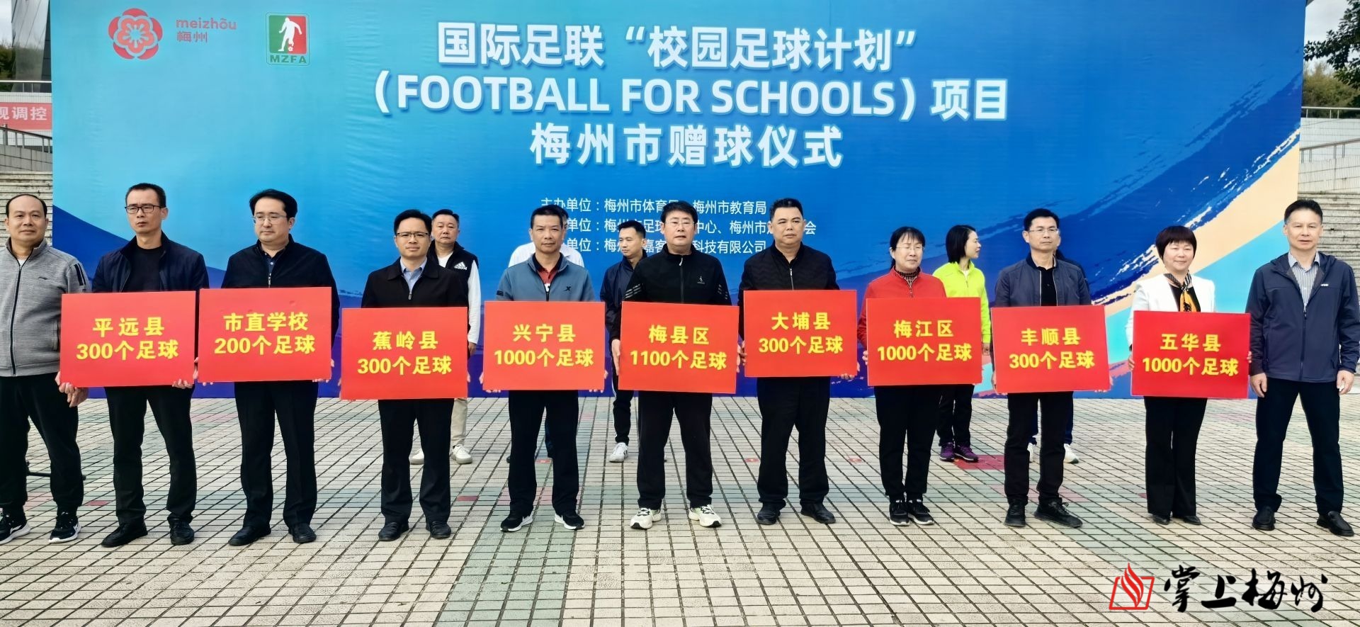 活動現場,與會嘉賓向各縣(市、區)教育局分管領導和市直學校代表、市、各縣(市、區)體校負責人、11所梅州市星級社會青訓俱樂部負責人、15所梅州市幼兒足球啟蒙特色示範園負責人發放了共8100個足球。