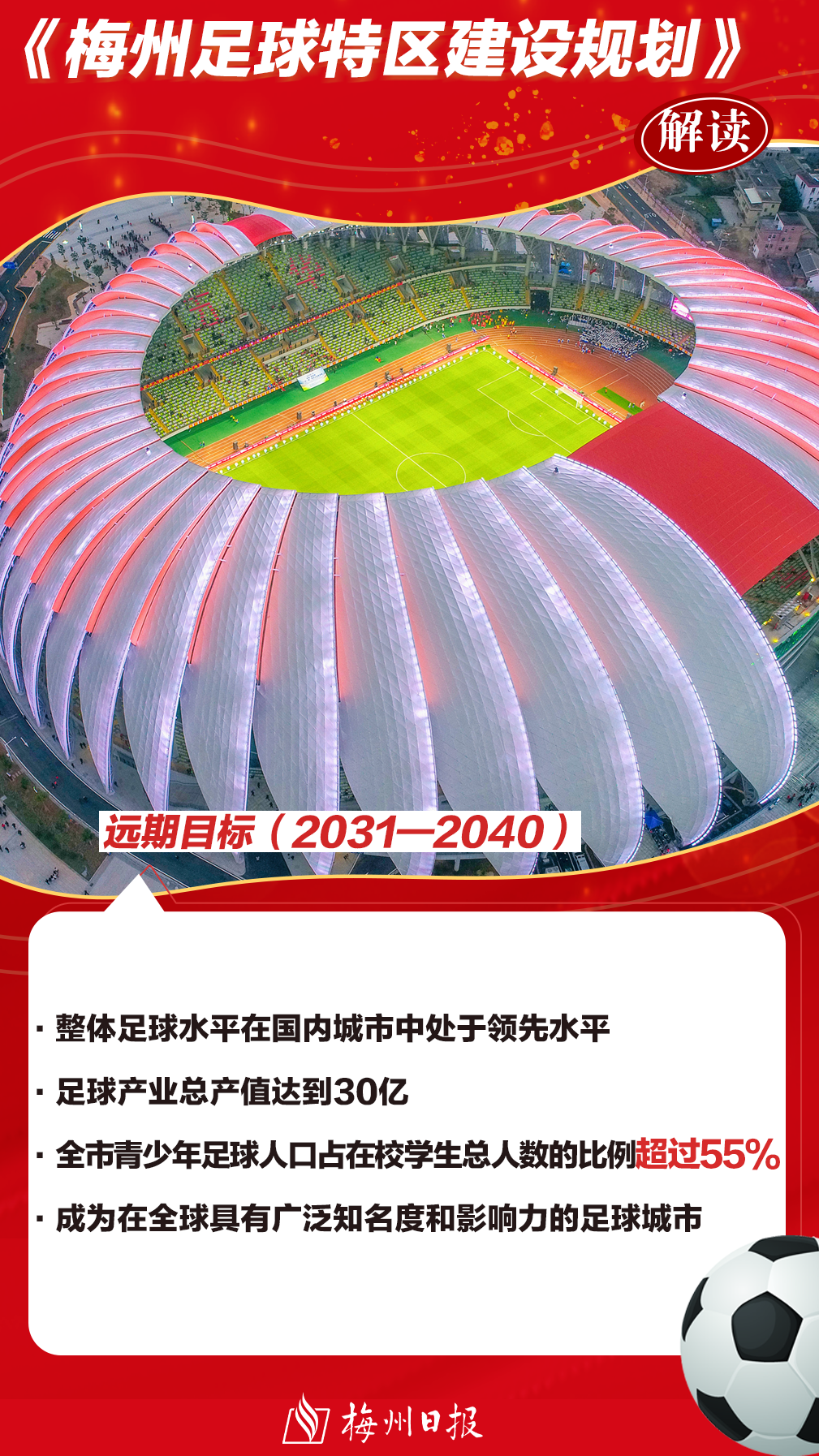 《規劃》指出,近期目標(2020—2025)新建或提升改造100塊足球場,具備開放條件的學校,100%校園足球場地實現免費或低收費對外開放,參加中乙聯賽以上的職業體育俱樂部總數達到2—3家,力爭實現男女職業俱樂部同時進入中國足協超級聯賽,培育2—3項具有國際影響力的品牌賽事,梅州培育的球員多人進入各級中國足球(男/女)國家隊,青少年足球人口占在校學生人數總數達到50%,足球發展的基本指標進入全國城市前列。