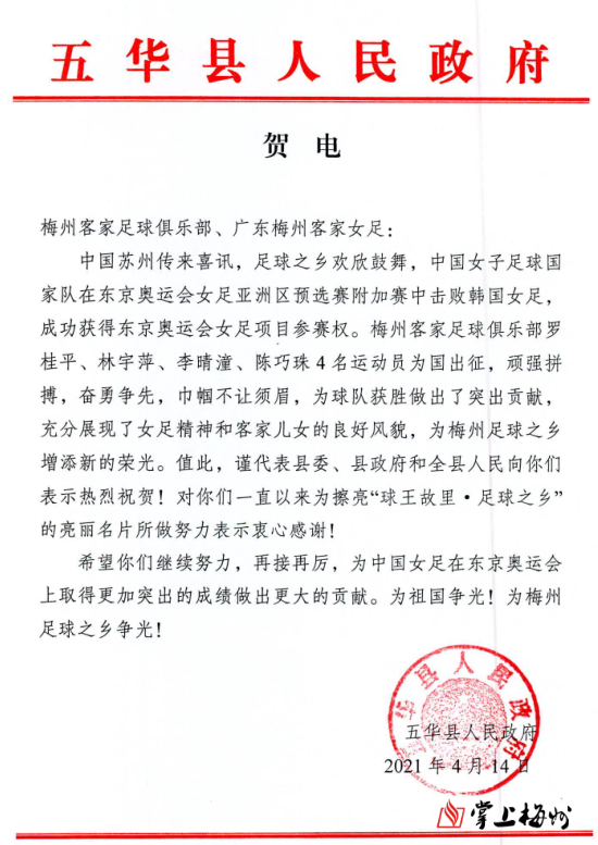 14日,記者從梅州客家足球俱樂部獲悉,五華縣政府向該俱樂部發來賀電,感謝梅州客家女足羅桂平、林宇萍、李晴潼、陳巧珠等4名運動員為梅州足球之鄉增添新的榮光。