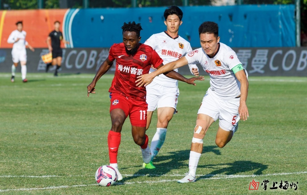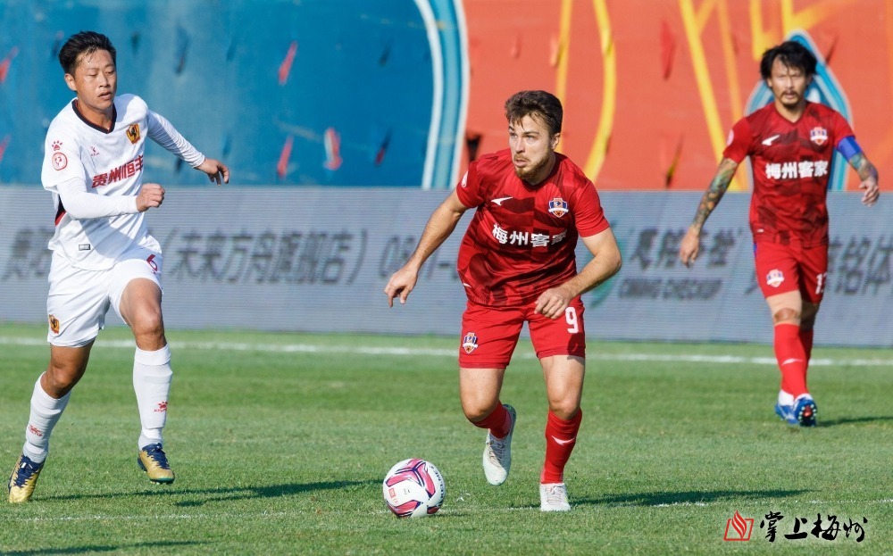 中甲聯賽第31輪一場焦點戰今天下午3時在橫陂足球小鎮進行,梅州客家隊吉森梅開二度,崔巍、劉盛、郭毅錦上添花,最終以5:0大勝貴州隊,重新登頂積分榜,離成功衝超僅差1分。