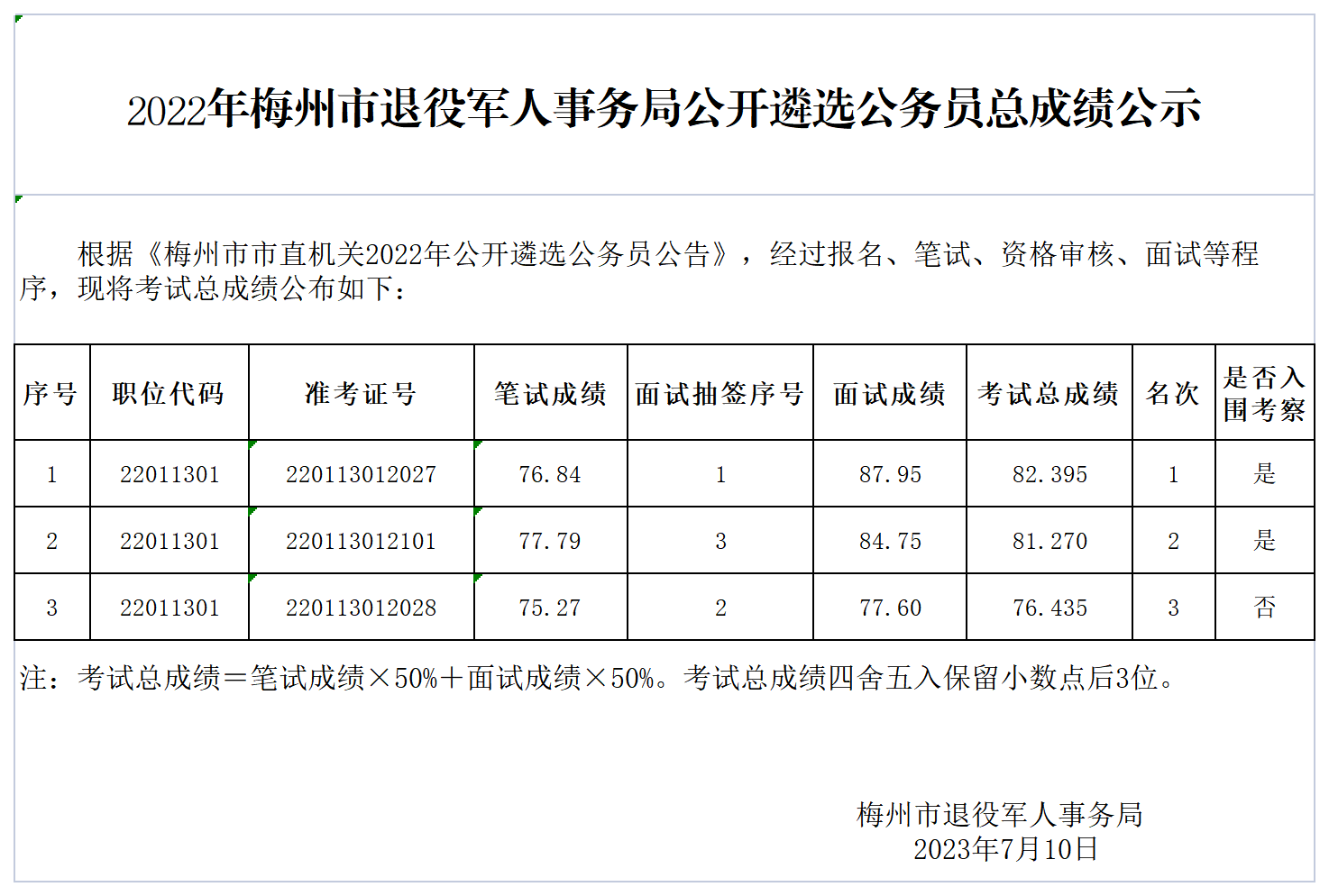 梅州市人民政府門戶網站 梅州市退役軍人事務局 通知公告 2022年梅州市退役軍人事務局公開遴選公務員總成績公示