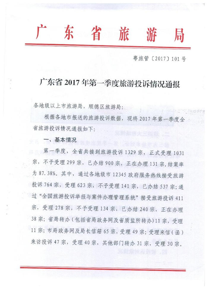 梅州市人民政府門戶網站 梅州市文化廣電旅遊局 旅遊投訴 廣東省2017年第一季度旅遊投訴情況通報