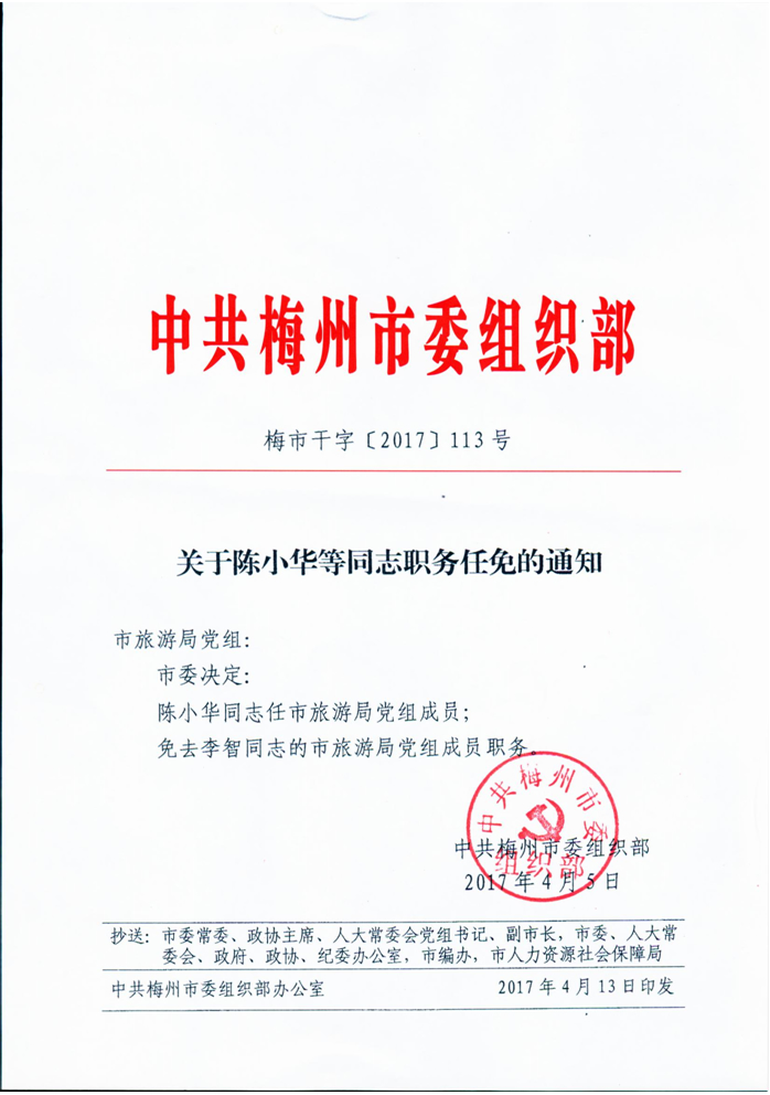 梅州市人民政府門戶網站 梅州市文化廣電旅遊局 部門文件 梅市幹字【2017】113號 關於陳小華等同誌職務任免的通知