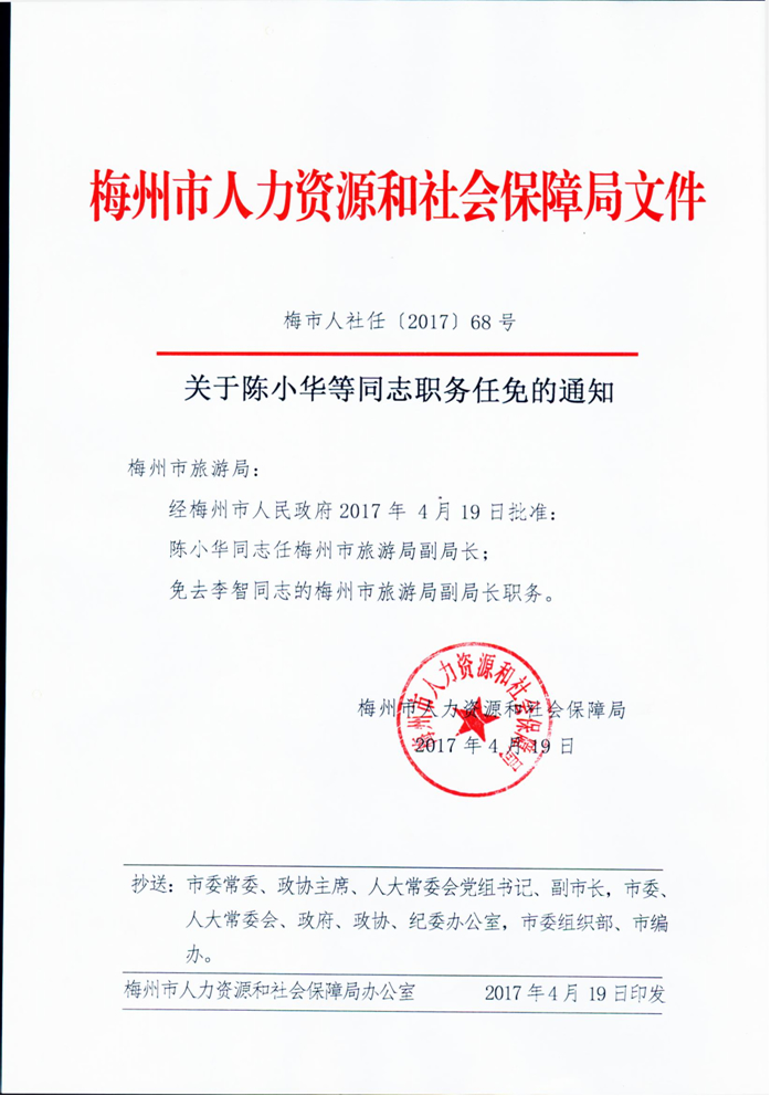 梅州市人民政府門戶網站 梅州市文化廣電旅遊局 部門文件 梅市人社任【2017】68號 關於陳小華等同誌職務