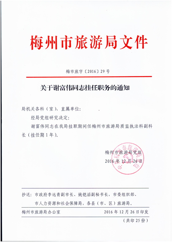 梅市旅字【2016】29號 關於謝富偉同誌掛任職務的通知
