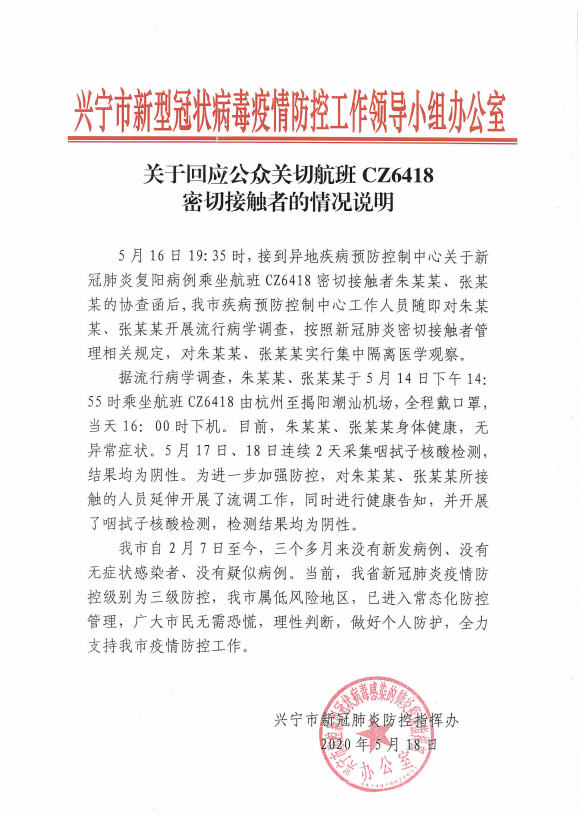 5月16日19:35時,接到異地疾病預防控製中心關於新冠肺炎複陽病例乘坐航班CZ6418密切接觸者朱某某、張某某的協查函後,我市疾病預防控製中心工作人員隨即對朱某某、張某某開展流行病學調查,按照新冠肺炎密切接觸者管理相關規定,對朱某某、張某某實行集中隔離醫學觀察。 據流行病學調查,朱某某、張某某於5月14日下午14:55時乘坐航班CZ6418由杭州至揭陽潮汕機場,全程戴口罩,當天16:00時下機。目前,朱某某、張某某身體健康,無異常症狀。5月17日、18日連續2天采集咽拭子核酸檢測,結果均為陰性。為進一步加強防控,對朱某某、張某某所接觸的人員延伸開展了流調工作,同時進行健康告知,並開展了咽拭子核酸檢測,檢測結果均為陰性。 我市自2月7日至今,三個多月來沒有新發病例、沒有無症狀感染者、沒有疑似病例。當前,我省新冠肺炎疫情防控級別為三級防控,我市屬低風險地區,已進入常態化防控管理,廣大市民無需恐慌,理性判斷,做好個人防護,全力支持我市疫情防控工作。