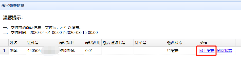 八、繳費成功後,如繳費狀態還是顯示“未繳費”或“待繳費”,點擊“刷新狀態”進行獲取最新的繳費結果並更新繳費狀態。