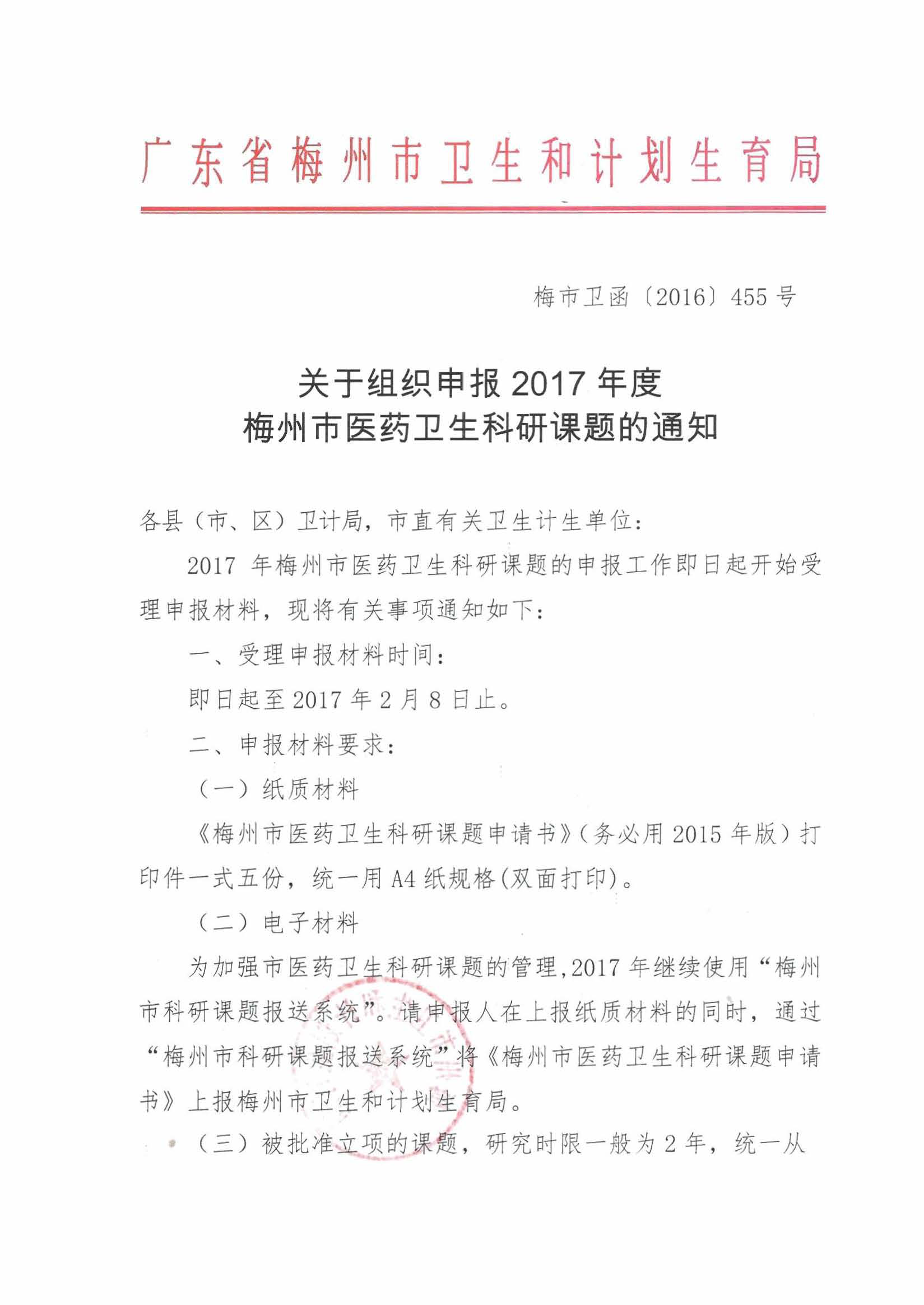 梅州市人民政府門戶網站 梅州市衛生健康局 下載專區 關於組織申報2017年度梅州市醫藥衛生科研課題的通知