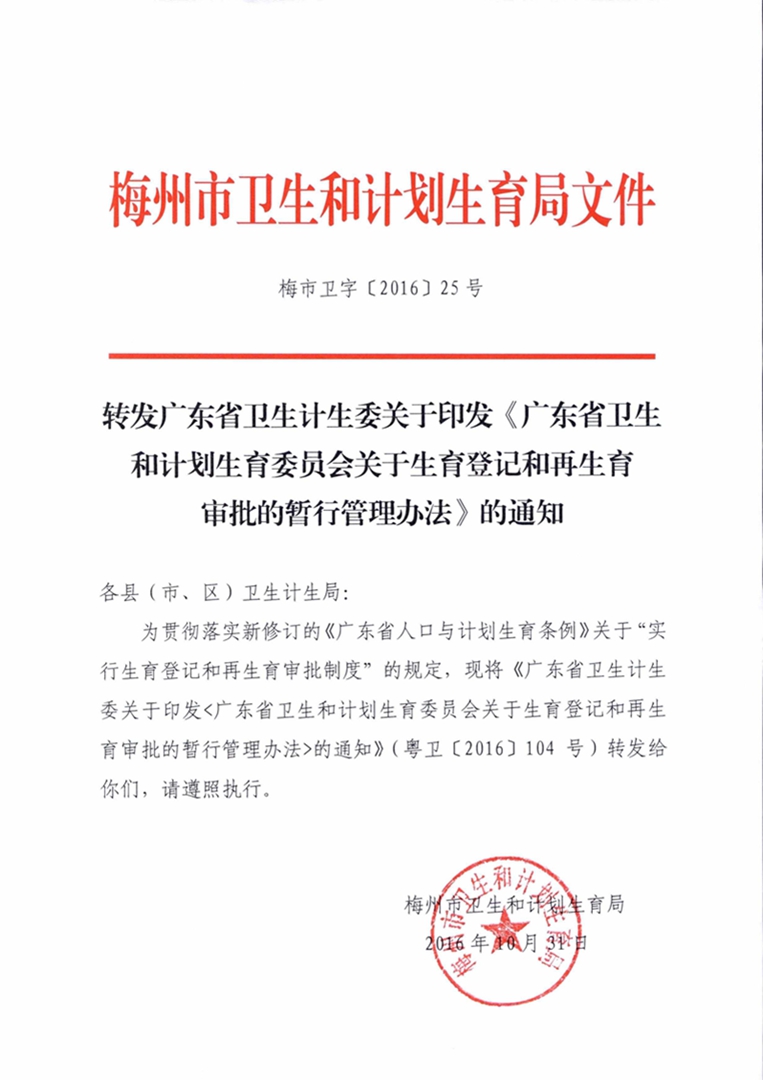梅州市人民政府門戶網站 梅州市衛生健康局 政策文件 轉發廣東省衛生計生委關於印發《廣東省衛生和計劃生育委員會關於生育登記和再生育審批的暫行管理辦法》的通知