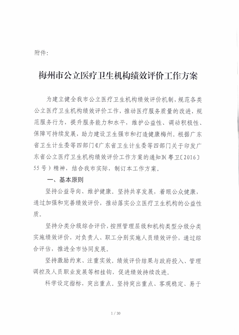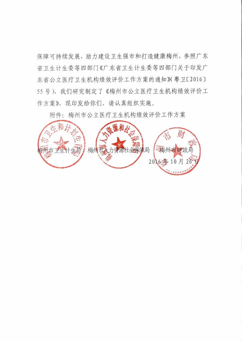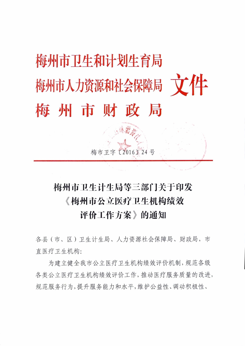 梅州市人民政府門戶網站 梅州市衛生健康局 政策文件 梅州市衛生計生局等三部門關於印發 梅州市公立醫療衛生機構績效評價工作方案》的通知