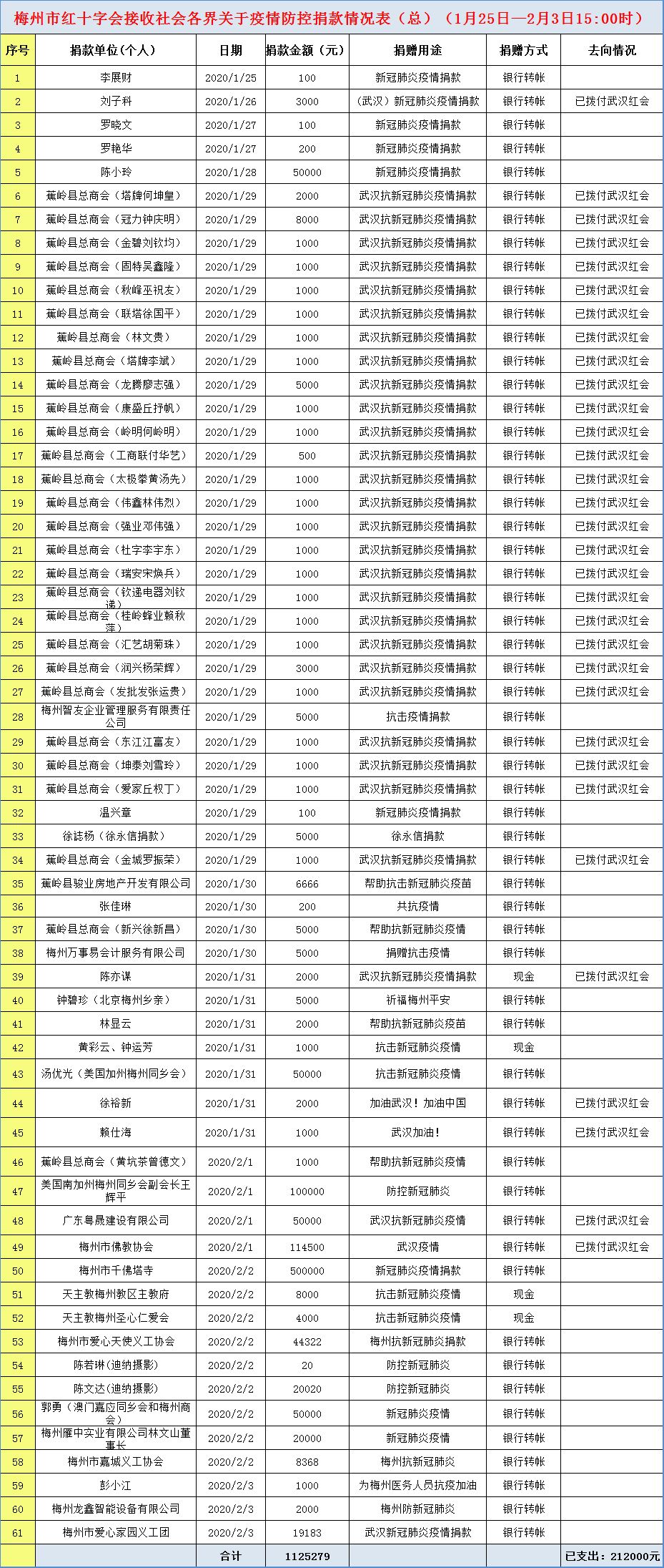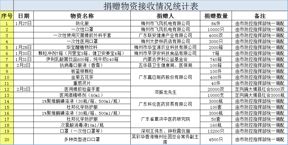梅州市紅十字會接收社會各界 關於疫情防控捐款情況表 捐贈物資接收情況統計表