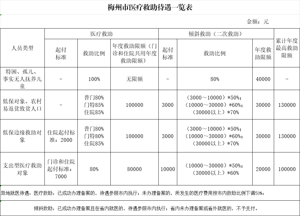 答:特困人員、孤兒、事實無人撫養兒童、低保對象、低保邊緣家庭成員和納入監測範圍的農村易返貧致貧人員參加梅州市城鄉居民基本醫療保險的,其個人繳費部分給予全額資助。