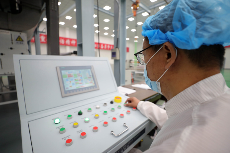 4月20日,工人在中國石油遼陽石化公司聚酯廠熔噴無紡布車間生產線上忙碌。新華社記者 楊青 攝