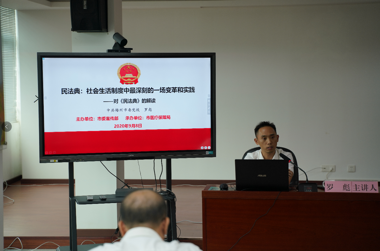 為保證宣講效果,市醫保局專門邀請了2020年全國兩會精神市委宣講團成員、市委黨校公共管理學教研部講師羅彪同誌,從編纂情況、重大意義、內容框架、實踐應用、推動實施等角度,對《中華人民共和國民法典》進行了深入淺出、通俗易懂的解讀。