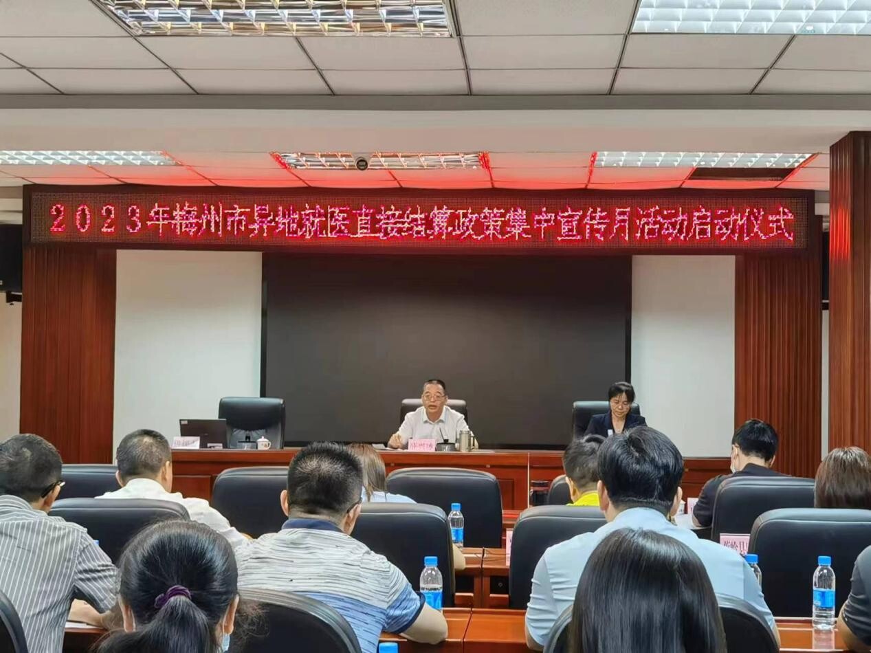 6月9日下午,梅州市醫療保障局組織舉行2023年全市異地就醫直接結算政策集中宣傳月活動啟動儀式,局長薛興冰作動員講話和工作部署。黨組成員、副局長姚清蘭、各縣(市、區)醫保局主要負責人、醫保中心負責人,定點醫藥機構代表等參加啟動儀式。