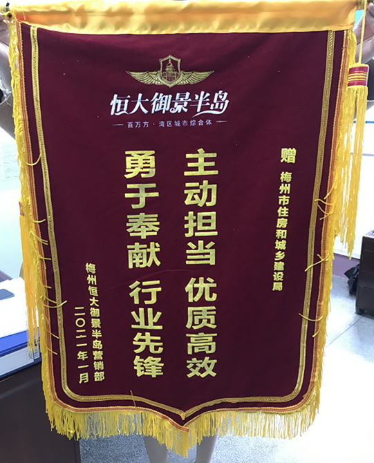 “真是非常感謝你們!”近日,梅州恒大禦景半島營銷部送來錦旗,感謝我局一直以來為企業提供優質高效服務、幫助解決所急所需,特別是在疫情期間,出台紓困政策措施、指導開展疫情防控、依法調處矛盾糾紛等所做工作,助力企業克服疫情影響、健康發展。