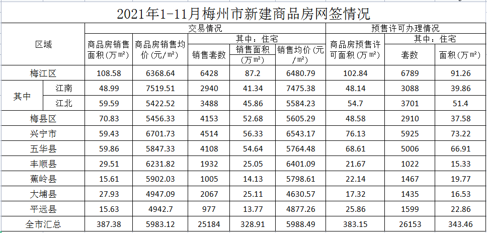 梅州市人民政府門戶網站 梅州市住房和城鄉建設局 房地產業 2021年1-11月梅州市新建商品房網簽情況