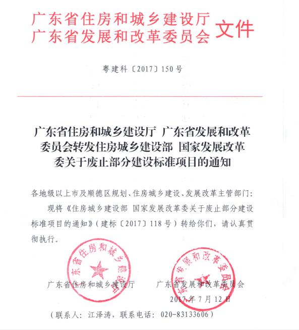 轉發粵建科[2017]150號關於廢止部分建設標準項目的通知