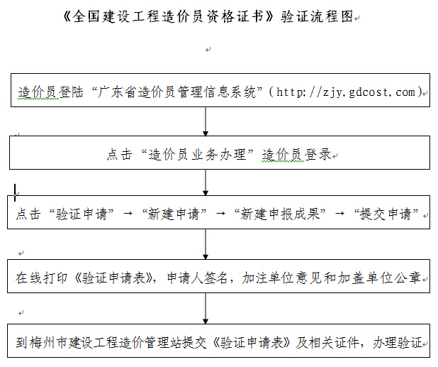 需驗證的造價員將《全國建設工程造價員資格證書》、《全國建設工程造價員繼續教育證書》和《廣東〈全國建設工程造價員〉驗證申請表》交到所在單位人事管理部門,由各單位人事管理部門集中到梅州市建設工程造價管理站辦理驗證手續。