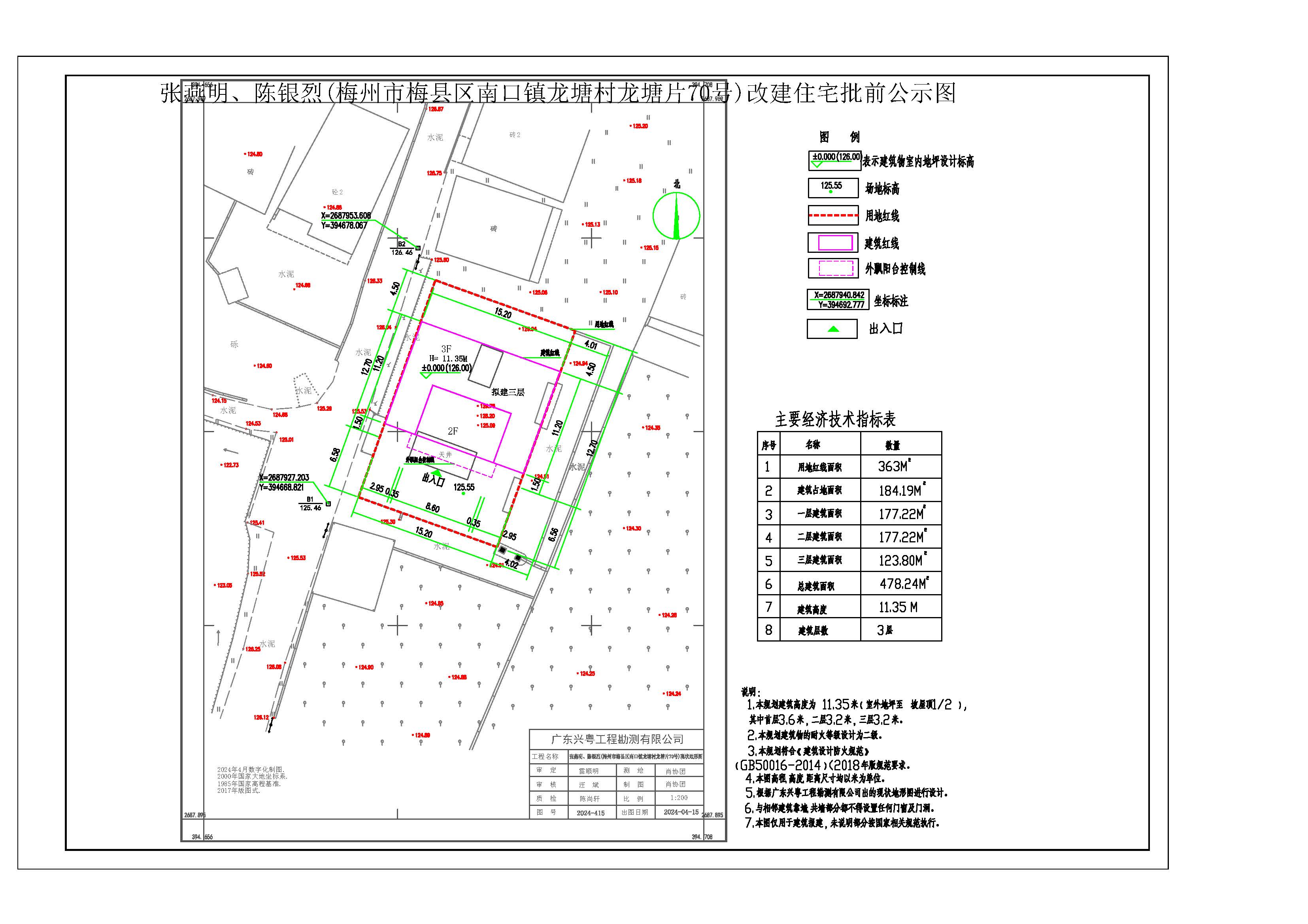 張燕明、陳銀烈原房屋位於梅州市梅縣區南口鎮龍塘村龍塘片70號,現張燕明、陳銀烈業主擬對梅州市梅縣區南口鎮龍塘村龍塘片70號房屋進行改建。具體報建方案為:建築基底麵積:184.19平方米,層數:2層(局部3層),總建築麵積:478.24平方米。本圖僅為示意圖,準確數據以最後審批為準。